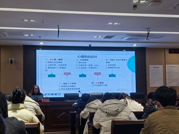 在心理危机应对环节,高主任明确了“安全第一、团队合作、倾向必报、计划必管、行为必医”的核心原则,详细讲解了自杀前综合征的警示信号及干预流程,强调要做到“积极倾听、及时上报、联动家属、专业转介”。同时,她分享了常州市心理援助热线12356、常州未成年人心理援助热线96111等专业资源,为班主任提供了实用的求助渠道。